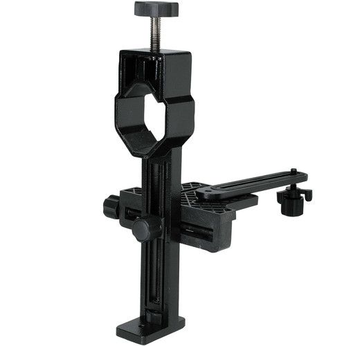 Horizontal and vertical movements, along with two selectable slots for the mounting bolt allows a connected camera’s lens to be aimed into a spotting or telescope’s eyepiece